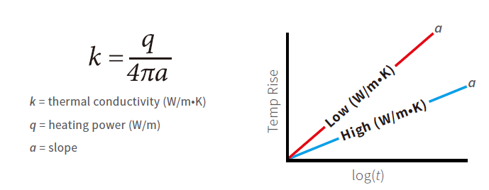 探針傳感器由一根較細的加熱線和溫度傳感器組成,溫度傳感器密封在長度為100mm的不銹鋼管中(50mm探針可選)。測量時,傳感器被完全插入待測的樣品中,采用恒流源(Q)將熱量傳遞到樣品,并在一定時間內記錄溫度的上升。利用溫度與時間對數的斜率(A) ,計算導熱系數(K)。熱導率越高,斜率越低。對于導熱系數較低的材料,則斜率較高。